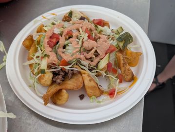Beer Battered Fries, Chopped Patty, Lettuce, Tomato, Pickle, Onion, Awesome Sauce